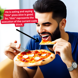 For instance, Rajesh is eating a pizza slice, and when eating he said, the pizza slice is tasty. So, the pizza slice which is currently being eaten refers to the this keyword which shows the function executing at present.