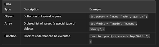 Non-primitive types: Object (including arrays, functions, and other objects).