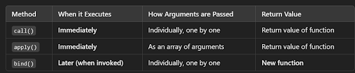 bind(): Returns a new function with a specified this value and optional arguments. The new function can be invoked later.