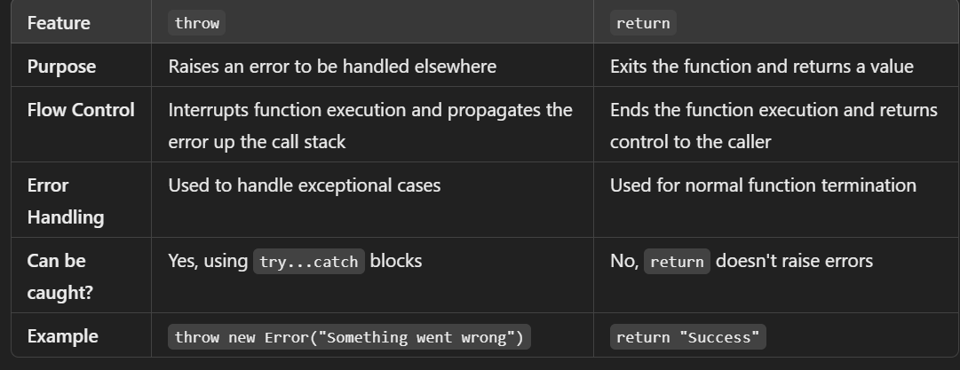 Answer: In error handling, throw is used to raise an exception, interrupting the current function's execution and propagating the error up the call stack, while return exits the function and provides a value without raising an exception.