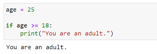 In this example, the code within the if block will execute if the condition `age >= 18` is true. Since `age` is `25` (greater than or equal to `18`), the message "You are an adult" will be printed.