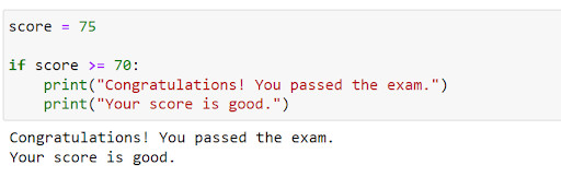 Here, the code within the if block will execute if the condition score >= 70 is true. As the score is 75, both print statements will be executed.