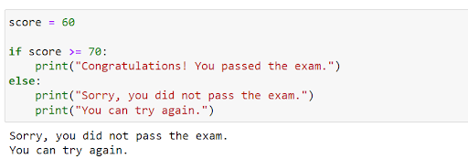 Here, if the condition `score >= 70` is false (as the `score` is `60`), the else block will be executed, printing both statements within it.