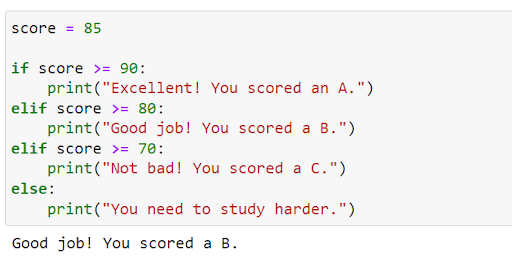 In this example, the score is `85`, which satisfies the condition `score >= 80`. Therefore, the corresponding block of code will execute, printing "Good job! You scored a B."