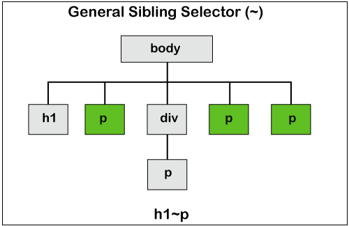 - General Sibling Selector (~) - A general sibling selector selects an element that is a sibling of another element. It matches any element that follows the specified element, regardless of whether it is immediately adjacent or not.