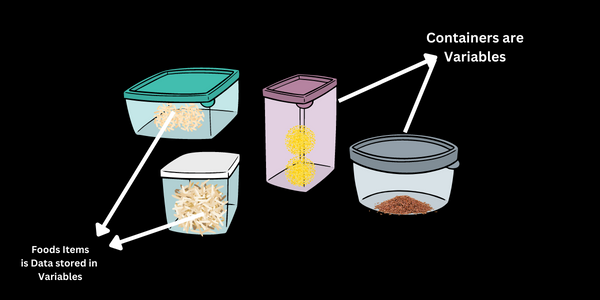 The Variables can be understood by an example that in our kitchen, we have various food items such as pulses, sugar, tea, coffee, and so on. So, the food items are data values and the container are variables.